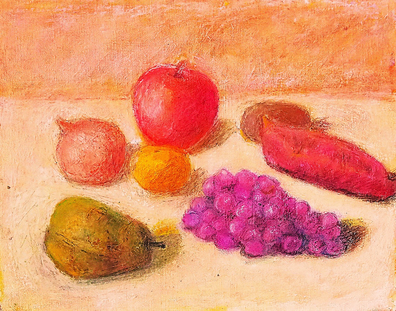 近所のスーパーマーケットで買ってきた洋梨とりんごと葡萄などの果物と野菜をスケッチし、その後油彩描きました。なかなかうまく描けず、時間がかかりました。